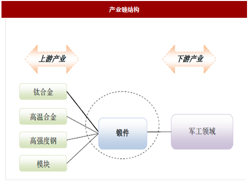 上游原料主要为钛合金、高温合金、高强度钢、模块等,经过加热、锻造、热处理、理化测试等环节的控制处理后形成不同类型的产成品,主要应用于军用领域。