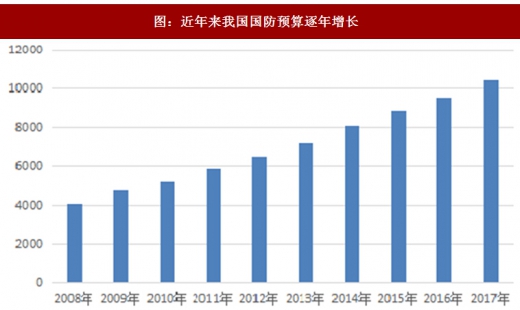 近年来,我国国防预算投入持续增加,2011 年至2016 年,国防费预算增幅分别为12.7%、11.2%、10.7%、12.2%、10.1%和7.6%。2017 年国防预算开支首次突破1 万亿元人民币,达到10,444 亿元,比上年增长7%。随着我国国防投入的增加和军队装备现代化水平的提高,以及“战略空军”战略定位的落实,我军对军工装备的需求也将大幅提高,从而带动军工锻件产品制造行业的快速发展。