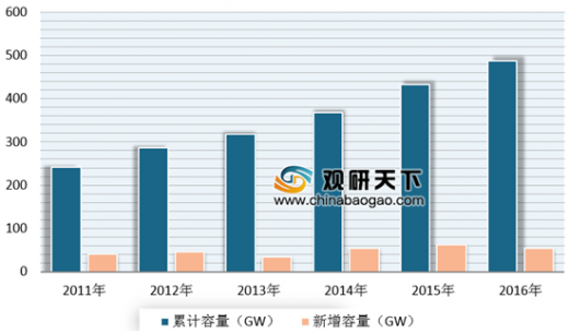 目前,全球已有 100 多个国家开始发展风电,但主要市场还是相对集中,并受欧洲、亚洲及北美的主导。据统计,到2016 年全球风电累计装机容量增至486.8GW ,全年新增54.6GW 装机容量;预计到 2021年,全球风电累计装机量将达到 817.00GW,2016-2021 年的年复合增长率达 10.91%。