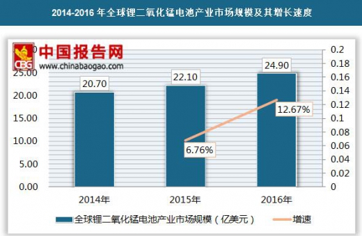 根据IIT统计,2016年全球锂二氧化锰电池产业市场规模达到24.9亿美元,同比增长12.67%。