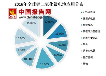 锂二氧化锰电池应用范围广泛,在无线电通信、便携式电脑、摄录像器、航模动力及遥控、医疗器械和玩具等方面使用广泛。以下为2016年全球锂二氧化锰电池应用分布统计。