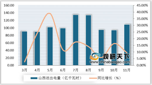 从山西省送出电量来看,5月送电量同比增长值达到最高38.90%。根据中电联数据显示,2019年1-11月山西省累计送出电量1121亿千瓦时,同比增长13.2%;11月当月送出电量109亿千瓦时,同比增长9.5%。