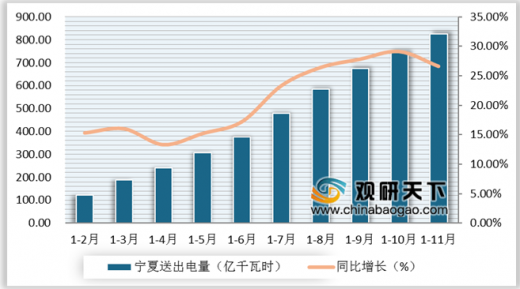 从宁夏送出电量来看,整体送电量波动幅度较大。根据中电联数据显示,2019年1-11月宁夏累计送出电量824亿千瓦时,同比增长26.6%;11月当月送出电量77亿千瓦时,同比增长6.7%。