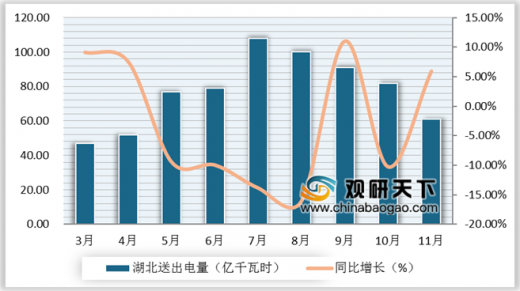 从湖北省送出电量来看,自7月开始送电量一直呈下降趋势。根据中电联数据显示,2019年1-11月湖北省累计送出电量783亿千瓦时,同比下降4.8%;11月当月送出电量61亿千瓦时,同比增长5.9%。