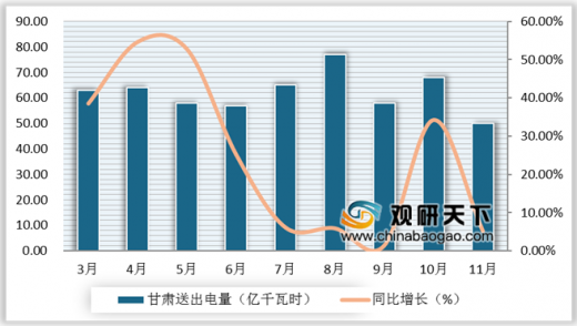 从甘肃省送出电量来看,5-9月增速下降幅度较大。根据中电联数据显示,2019年1-11月甘肃省累计送出电量679亿千瓦时,同比增长22.5%;11月当月送出电量50亿千瓦时,同比增长5.2%。