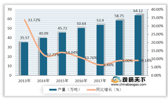 我国功能性食品产量逐年上升,增速逐渐放缓。2018年功能性食品产量为58.75万吨,同比增长9%;2019年中国功能性食品产量达到64.12万吨,同比增长9.14%。