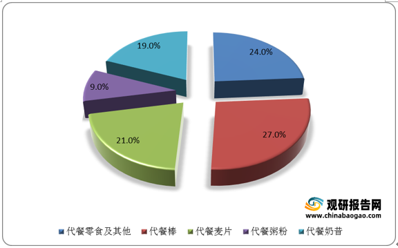 从代餐食品细分市场来看,代餐零食及代餐棒较受市场欢迎。数据显示,2019年代餐零食及代餐棒市场份额分别为24%、27%。