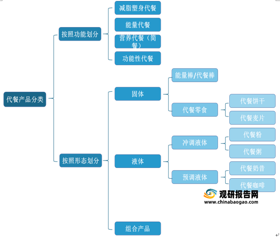 根据观研报告网发布的资料显示,在消费者的认知中,代餐类产品不仅包含功能性较强的代餐奶昔粉等品类,也包含麦片、五谷粉等较为传统但也可用于取代正餐或部分取代正餐的品类。根据功能划分,代餐食品可分为减脂塑身代餐、能量代餐、营养代餐(简餐)、功能性代餐四大类;按照形态划分,代餐食品可分为固体代餐、液体代餐、组合产品三大类。