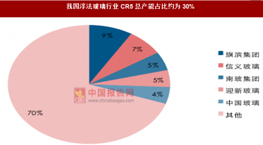 新增产能递减。2009 年平板玻璃被列入产能过剩行业,产能利用率从前期的 90%以上下降至 80-90%区间,但真正步入严重产能过剩是在 2014 年以后,产能利用率下降至70-80%区间,行业产能增幅也随之逐年递减。玻璃行业多为民营企业,企业进入门槛低、企业数量多,类似于完全竞争行业;且集中度不高,目前我国平板玻璃行业 CR5总产能占比约为 30%、在产产能占比约为 32%;CR10 分别约为 48%、48%。