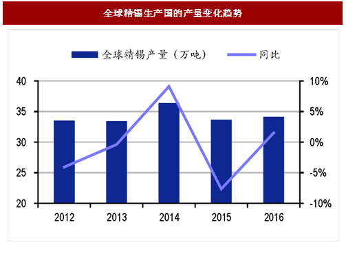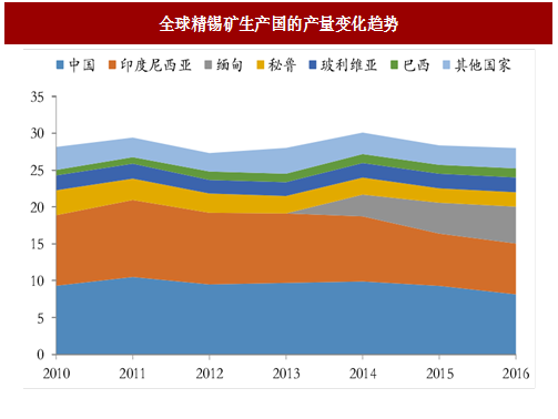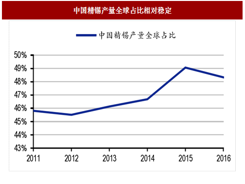 全球精锡产量主要集中于中国。2016年全球精锡产量为34.14万吨,同比小幅回升1.5%,中国精锡产量全球占比48%,主导全球精锡产量趋势;其他生产国包括印尼、马来西亚、秘鲁、玻利维亚等,供给结构总体稳定。
