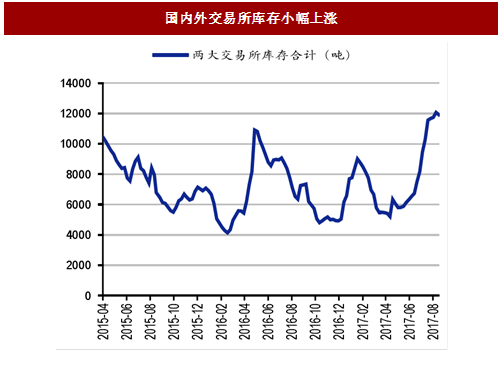 全球交易所库存短期回升压制锡价。2017年以来,LME库存与上期所合计库存呈现增加态势,由年初的7000吨左右逐步上升至12,000吨,这一增量已排除了交易所移库行为。交易所库存通常代表了国内外市场矿山企业的态度与实际供需基本面的表征,短期库存回升对锡价有压制作用,但也应注意到今年隐形库存显性化的特点较为明显,我们认为实际供给仍处于紧平衡状态。