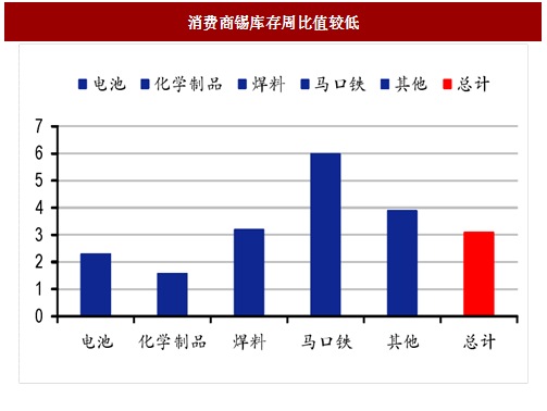 全球锡库存处于长周期底部。考虑到全球两大交易所和生产商消费商手中的库存,当前全球锡库存预计小于2.5万吨,若将美国的战略储备考虑进去,目前全球锡库存量正处于20年的历史低位,其中下降幅度最大的是美国战略储备。企业库存周比较低。根据80家公司提供的库存数据得出供应周数的加权平均值,其中电池行业为2.3周,化学制品为1.6周,焊料为3.2周,马口铁为6.0周,其他行业为3.9周,总计为3.1周,处于历史较低水平。