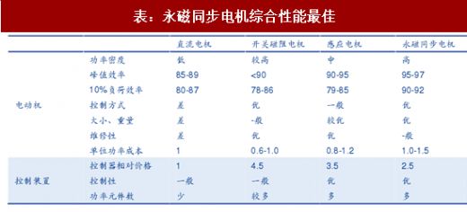 全球汽车电动化势不可挡,爆款车型将层出不穷,新能源车上游需求有望超预期。总体结论是全球汽车电动化大潮已起,爆款车型将层出不穷,带电量、能量密度将持续提升,中长期上游金属原材料的需求有望超预期。海外方面,我们统计的海外五大知名车企 2025 年新能源汽车销量占比目标一致达到 10-25%,若假设各车企汽车销量维持稳定(取 2016 年销量),中性粗略估计海外五家车企新能源汽车 2020 年总销量将达到 125 万辆;如果按照 2016 年该五大车企传统汽车销量占全球 22.9%这一比重倒算,2020 年全球新能源汽车产量保守估计超过 500 万辆。新能源汽车发展带动永磁同步电机需求。新能源汽车的驱动电机可以采用永磁电机、直流电机、感应电机、开关磁阻电机等 4 种,其中永磁同步电机的综合性能最为优越。随着电力电子技术、新型电机控制理论和高性能钕铁硼产业的快速发展,永磁同步电动机得以迅速的推广应用。