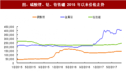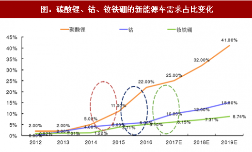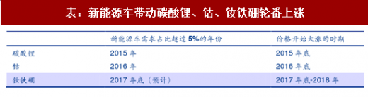 “5%”,原材料价格上涨加速启动点。再看到钕铁硼,新能源车永磁同步电机用钕铁硼需求占比(在整体钕铁硼需求中的占比,而非仅仅在高性能钕铁硼需求中的占比)在 2016 年为 4.18%,预计 2017 年底将达到 5%,与此同时钕铁硼价格在 2017 年 6 月已经开始出现一定涨幅,我们可以通过三者之间相似相缠的规律预测,2017 年的钕铁硼或许就像 2015 年的碳酸锂、2016 年的钴,将在 Q4 左右迎来其价格的大涨。