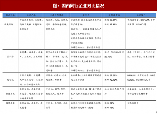 随着石英行业及相关产业链的技术发展,石英股份、菲利华等国内石英玻璃领先企业正在加速进行产业结构升级,向高端化迈进,光纤、半导体、特种光源、光学等领域正处于快速发展通道,未来石英玻璃高端市场的国产替代有望加速。