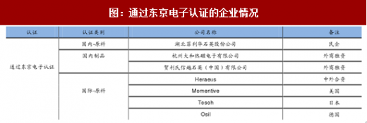 技术实力方面,公司是国内独家军工石英纤维材料供应商;半导体领域2011年通过东京电子的认证,全球目前共有5家企业通过该认证,公司是国内唯一一家。