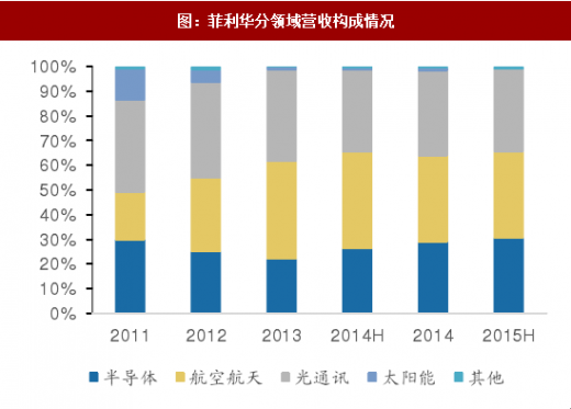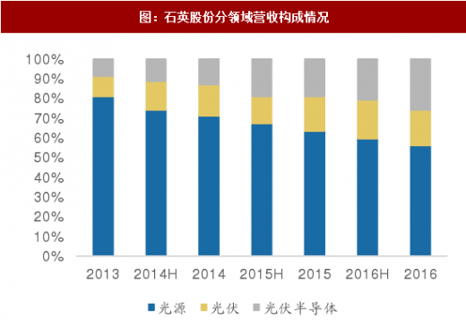 下游应用领域方面,主要是光源、光纤半导体、光伏,目前公司营收占比最高的仍然是光源行业,2016年占比55.80%,但处于持续下降通道;其次是光纤半导体行业及光伏行业,分别占比26.33%, 17.87%。光纤半导体占比持续提升,2017年全年预计将达到40%。