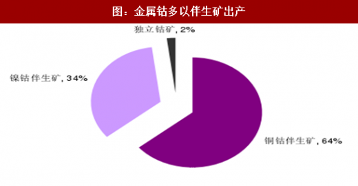大自然中已知的含钴矿物有近百种(硫钴矿、纤维柱石、辉砷钴矿、砷钴矿、钴华等),但单独的钴矿物极少。其中全球主要的钴供应来自铜钴伴生矿,镍钴伴生矿。根据钴业分会统计,铜钴伴生占比 64%、镍钴伴生占比 34%、仅 2%来自独立钴矿。其中刚果(金)以铜钴矿为主,澳大利亚以硫化铜镍钴矿及镍土红土矿为主,古巴以红土镍矿为主。
