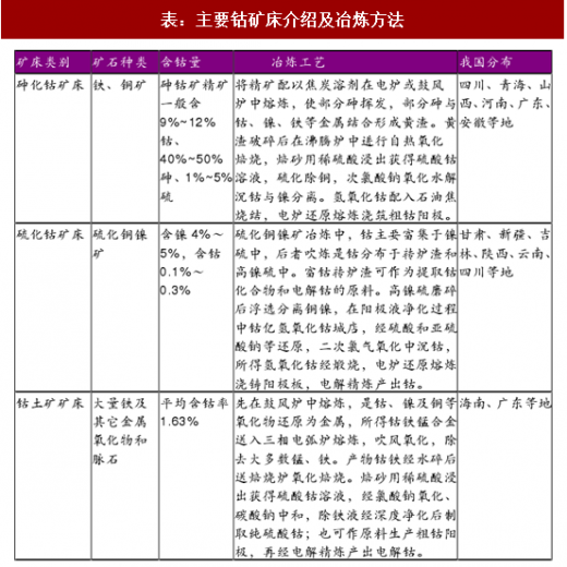 钴在地球上分布广泛, 但含量很低, 其地壳丰度仅为 25 ×10-6 , 在最常产出的超基性岩中平均含量也仅为 110 ×10-6 。自然界中钴的赋存状态主要有 3 种:以独立钴矿物形式存在、以类质同像或包裹体形式存在和以吸附形式存在, 其中以第 2 种形式最普遍。自然界中,单一钴矿少,一般分为砷化钴矿床、硫化钴矿床和钴土矿矿床三类。从中提取钴的方法大致有两种, 一种是矿石或含钴废料经火法预处理, 使钴初步富集, 然后通过湿法提取;另一种是全湿法生产钴, 先将钴原料经湿法浸出, 使钴进入溶液中, 经脱除杂质制备纯净钴溶液, 再经电解制得金属钴。钴冶炼特点表现为原料品位低,提取流程长,提取方法多。