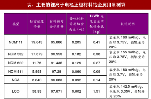 镍钴锰(NCM)材料,产品型号从 111 三元(N:C:M=1:1:1)到 424,532, 622,811。随着镍含量递增,电池能量密度也相应得到了提升。首先得到理论上每吨 NCM111,532,622,811 及 NCA、LCO 消耗的钴金属量,然后计算出 1kWh 电池容量的各类正极材料类型需要耗用的钴金属量(详见下表)。根据测算,每 1kWh 的 NCM111,532,622,811 及 NCA、LCO 消耗的钴金属量分别为 0.41kg,0.38kg,0.27kg,0.09kg,0.14kg,1.51kg。