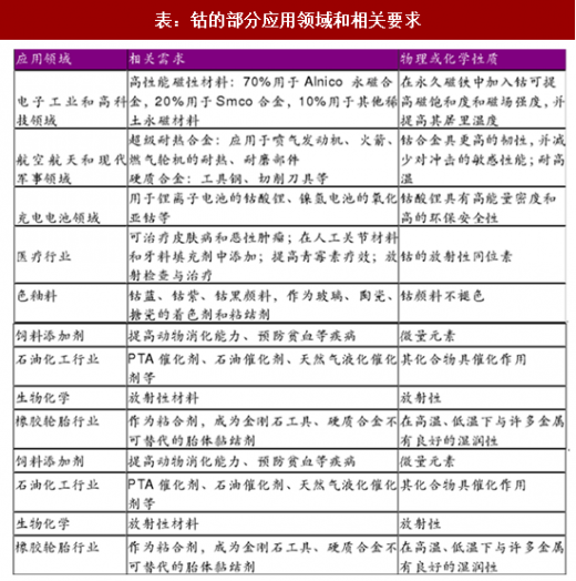 钴具有磁性,在硬度、抗拉强度、机械加工性能、热力学性质、电化学行为方面与铁和镍相似。钴的物理、化学性质决定了它是生产电池材料、高温合金、硬质合金、磁性材料和色釉料等材料的重要原料。钴不但是重要的民用物资,也是重要的战略物资,是国防工业和航空航天工业发展中必不可少的金属。