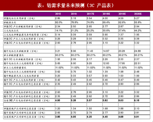 由于全球 3C 市场逐渐趋于饱和,我们给予国内外 3C 产品钴的需求量 6%的增速,并且以每年 1%的速度递减。