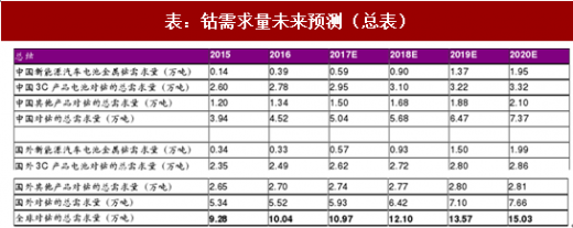 光大证券研究所预测预计 2020 年,全球新能源汽车对钴需求量为 3.95 万吨,是 2015 年的 11 倍,占总需求量比将提升至 23%(15 年为 3.6%);国内新能源汽车对钴需求量为 1.95 万吨,是 2015 年的 14 倍,占国内总需求量比将提升至 26%(15 年为 3.5%)。