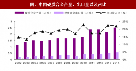 硬质合金作为钴的第二大消费领域(硬质合金生产中主要以钴粉形式作为粘结剂,含量通常为 7%-10%),需求平稳上升有望拉动钴需求。根据中国钨业统计,中国的硬质合金产量整体处于上升趋势,2002 年为 1.15 万吨,2014 年为 2.49 万吨,年均复合增长率为 6.6%。同时,中国硬质合金的出口量占总产量的比例也处于上升势头。2002年占比为14.79%,2014年为21.91%。出口占比的提升,一定程度说明我国硬质合金的质量和技术受到了国外的认可,未来硬质合金仍是我国钴主要的消费领域之一。