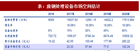 假设我国未来几年废钢消费量年维持10%增长,则到2020年使用加工设备处理的废钢将达到7900万吨。我国目前废钢处理厂规模万吨到50万吨不等。以较大型的30万吨处理厂为例,约需大型破碎机、剪切机、打包机和检测设备总价值8000万元。按此计算,2020年前我国设备市场空间将超100亿元,年复合增长率52%。可以预见随着比率的快速提升,设备需求也将持续高速增长。