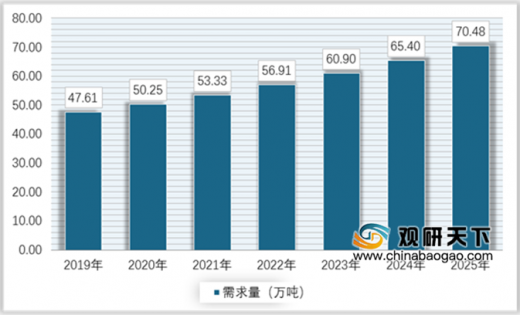 需求方面,我国磁控溅射靶材的需求量尽量保持稳定增长,截止2018年我国磁控溅射靶材需求量达到45.37万吨。未来我国磁控溅射靶材需求量未来将继续保持增长,预计到2025年我国磁控溅射靶材需求量将达到70.48万吨。具体如下: