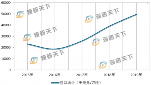 自2017年来,我国废铜进口均价逐年提高,2019年中国废铜进口均价为49494.44千美元/万吨,同比2018年增加10684千美元/万吨。