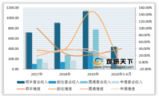 2017-2020年4月,顺丰控股营业收入最高,为3164.19亿元,其次是圆通速递,为1313.88亿元,申通快递营业收入最低,为576.05亿元。其中,2020年1-4月仅有顺丰控股营业收入呈正增长趋势,其余三家快递公司营业收入均呈负增长趋势。