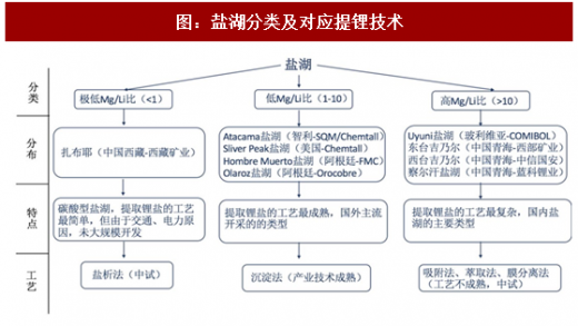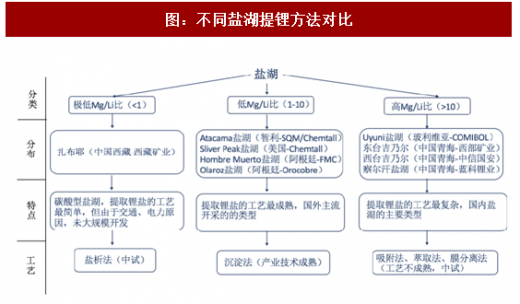 不同的Mg/Li比对应不同的提锂技术。对于南美地区低Mg/Li比的盐湖,一般采用沉淀法进行提锂;我国西藏的扎布耶盐湖因Mg/Li比极低,采用简单的盐析法即可获得锂产品,而青海地区的高Mg/Li比盐湖提锂技术相对复杂,一般有吸附法、萃取法、膜分离法等。