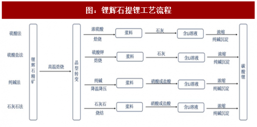 锂辉石精矿的提取工艺以硫酸法为主,加工成本约为2-2.5万元/吨。锂辉石提锂的主要方法为酸提取的硫酸法、硫酸盐法和碱提取的纯碱压煮法、石灰烧结法,其中硫酸法因锂回收率高为主要的提取工艺,该工艺除锂精矿外的单耗为2-2.5万元,综合成本取决于锂辉石精矿的来源,在3-7万元/吨。