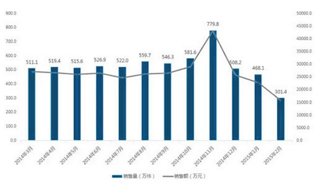 2014年3月-2015年2月洗面奶网络零售销售量及销售额变化情况