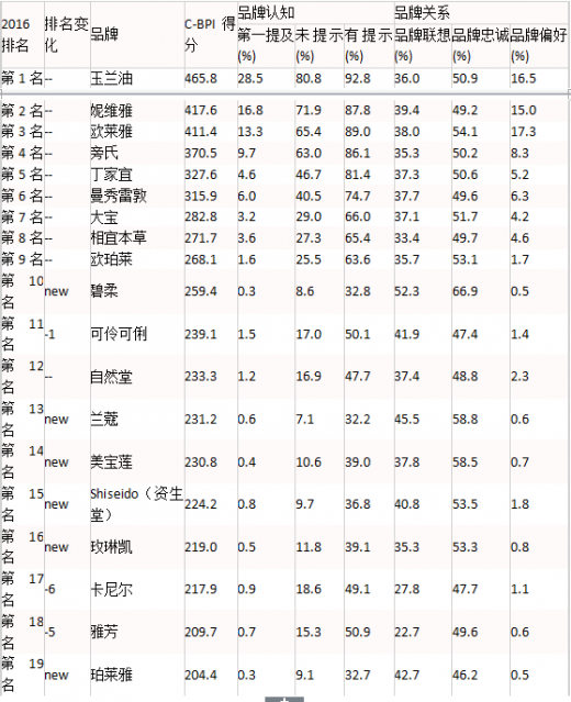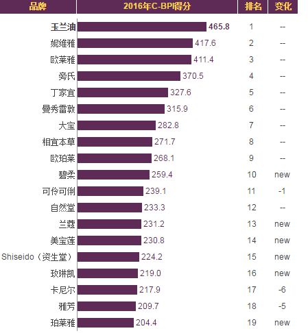 在中国洗面奶行业最具影响力品牌C-BPI排名中,玉兰油位居第一,C-BPI得分465分;妮维雅第二名417(分);欧莱雅第三名411(分);旁氏第四名370(分);丁家宜第五位327(分);曼秀雷敦第六位315(分);大宝第七位282(分);相宜本草第八位271(分);欧珀莱第九位268(分);碧柔第十位259(分)。