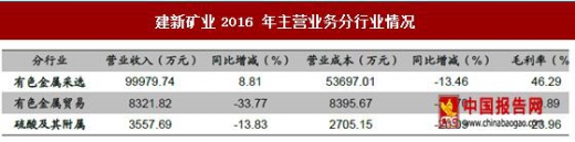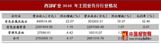 公司主营业务包括矿采选业务、金属贸易业务和产业链增值服务。有色金属矿采选业务主要生产锌、铅、铜、钨、锡、金、银等各类精矿,依托矿山资源的优势, 金属贸易业务主要为有色金属产业链上下游企业提供矿产品原材料、金属产成品等购销服务已逐渐发展成为公司业务的重要组成部分,2016 年公司共实现营业收入127.1 亿元,同比增长为90.78%,主要为金属贸易收入121.3 亿元,较上年同期增幅99.39%。