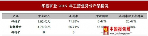 主营收入情况。华钰矿业2016 年营业收入合计6.68 亿元,同比上涨11.67%;归属于上市公司股东净利润1.87 亿元,同比上涨15.16% ;基本每股收益0.36 元/股,同比上涨2.86%。