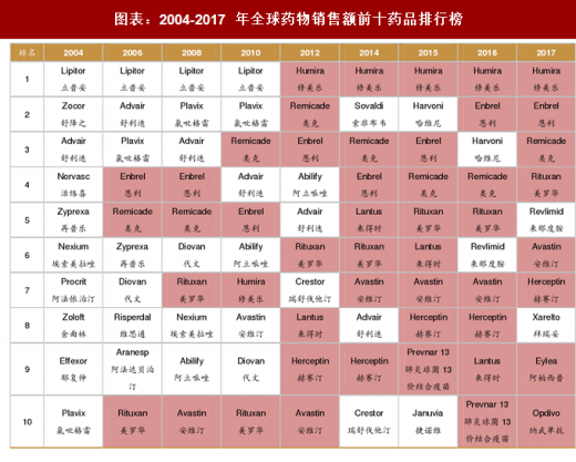 一、全球前十大畅销药,生物药占比逐年上升,2016 年即占八席