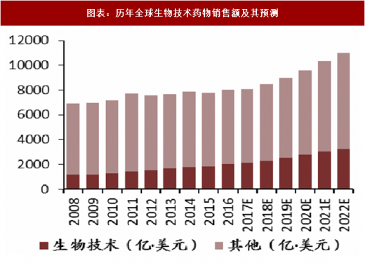 对于未来市场,Evaluate Pharma 预测生物药将会继续维持强势的市场地位,预计生物药的市场份额将会从 2016 年的 25%(2020 亿美元)上升到 2022 年的 30%(3260 亿美元)。全球领先的医药研发公司对生物大分子药的关注日益增加,仅全球最大的 18 个制药公司的生物药在研品种就超过了 900 种。生物药研发资源及资金的投入、技术的不断进步以及对疾病的认识不断提高,促使制药公司可不断研发出具有卓越疗效及安全性的创新生物药。我们认为生物药快速增长主要由以下三个因素推动: