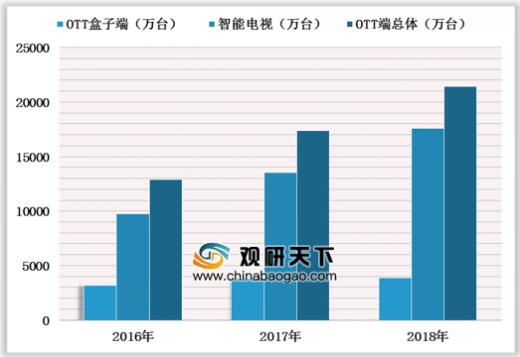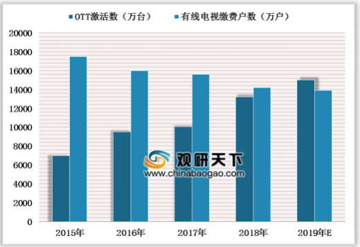 据奥维云网数据显示,近几年OTT 端市场呈现爆发式增长,未来将释放巨大增长潜力。预计至 2020 年,OTT 端市场规模将达到 6300 亿元,蓝海市场有待进一步开发。从最近几年有线电视缴费户数来看,下降趋势明显,OTT 终端激活数则一路上涨,预计 2019 年 OTT 终端用户将首次超过有线电视用户,OTT TV 成为未来主流已是大势所趋。