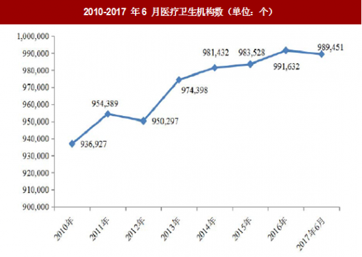 统计数据显示,我国 医疗 卫生机构数量,从2010 年的936,927 个,增加到2017 年6 月底的989,451 个,其中:医院29,719 个,基层医疗卫生机构932,516个,专业公共卫生机构24,345 个,其他机构2,871 个。大量新建的医疗机构及基层医院,为完善自身医疗条件,需要添置数字X 光机设备,进而将带动我国DR摄影产品的市场需求。另一方面,国内医疗条件较好的高端医院,由于早期配备了屏片式X 光机,为改善诊断条件及提高医院效率,需将原有设备更换为数字X 光机,医疗机构的这种更新换代需求也成为我国DR 摄影产品市场进一步发展的重要因素。