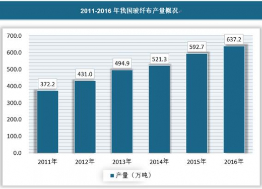 近年来,我国玻纤布产量稳步上升,截止2016年底,我国玻纤布产量达到637.2万吨。