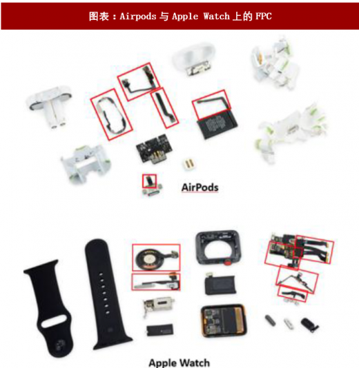 2014 年的 FPC 在 iPhone6 指纹识别模块的应用,2016 年 iPhone7 双摄像头的应用,每一次苹果的硬件升级都为 FPC 带来新的增长空间。2017 年 iPhone X 零组件迎来了史无前例的全面升级,以 OLED 全面屏、3D 成像、无线充电为代表的功能创新使其 FPC 数量达到了 20 片以上,单机价值量从上一代的 30 美金左右大幅提升到 40 美金以上。FPC 应用范围全面覆盖了闪光灯&电源线、天线、振动器、扬声器、侧键、摄像头、主板、显示和触控模组、HOME 键、 SIM 卡座、独立背光、耳机孔和麦克风用 FPC 等,加上 iPad、iWatch,AirPods 等,苹果每年 FPC 采购量约占全球市场一半份额,而日台大厂均为主力供应商。