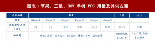 苹果产品中 FPC 用量的增长不仅能够直接给各 FPC 供应厂商提供大量订单,还会拉动安卓阵营各厂商对其beplay下载软件 产品的投入。深受苹果手机坚定使用 FPC 板的影响,目前主流品牌均在其产品中引入越来越多的 FPC,三星单机用量约 12-13 片,主要由本土的 Interflex 、SEMCO 等厂商;HOV 单机用量约 10-12 片,除日台大厂,国内的景旺电子、弘信电子也是供应商。beplay下载软件 手机 FPC 板的单机用量均达到了 10-15 片,有效推动了 FPC 板的需求。未来我们有望能看到越来越多的 FPC 出现在各个品牌beplay下载软件 终端,从而带动整个 FPC 产业链的成长。