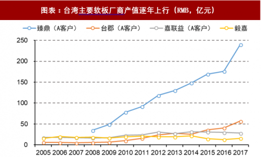 台资企业很多是苹果的供应商,相对于一般消费 电子设备 ,苹果产品质量要求更严格,产品更新迭代频率更快,及时应对变化实现量产是台资企业成功的关键性因素;另外,台湾本土材料供应链齐全,提供高端材料诸如层压板和铜箔,无需依赖于日本材料商而有效地降低了成本。台资企业的整体繁荣主要是由以苹果为代表的中高端消费电子驱动,软板厂商产值逐年上行。