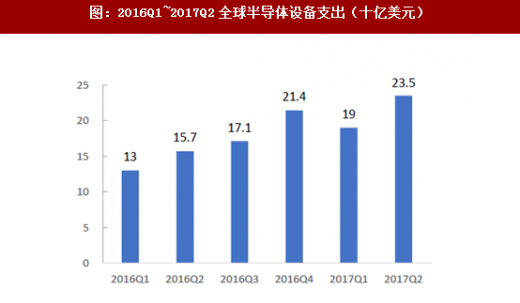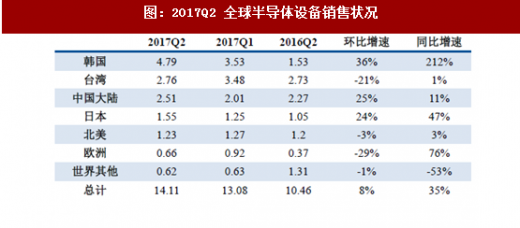 全球半导体设备销售额再一次创历史新高,反应下游晶圆代工厂商、IDM企业扩产动力充足。根据国际半导体产业协会(SEMI)的出货报告,2017Q2全球半导体制造设备成交金额达到141亿美元,同比增长35%,创下季度历史最高纪录,比17Q1历史记录高出8%;2017年8月北美半导体设备制造商出货金额达到21.8亿美元,同比增长27.7%,环比7月下滑3.9%(环比下滑主要是7月基数较高影响)。