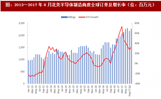 图:2013~2017年8月北美半导体制造商度全球订单及增长率(位:百万元)