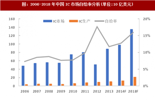 中国IC自主生产量与消耗量差异极大,自给率仍然处于较低水平。根据IC Insights的数据,中国IC市场自给率在2008年仅为8.7%, 2014年为12.8%,预计2018年为16.0%, 2018年供需缺口将达到1135亿美元。因此国内自2014年《集成电路发展纲要》发布以来,各地陆续新建大量晶圆代工厂,以满足国内市场需求。