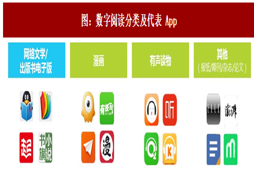 数字阅读涵盖范围较广,主要包括以数字文件为内容载体的公开出版物,以其呈现形式不同可分类为:网络文学/出版书电子版,漫画,有声读物和其他(以报纸、期刊、杂志、论文等为代表的电子期刊杂志)等,在这其中又以网络文学和出版书电子版为主要成分。